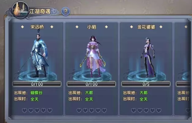当然这种奇遇的好事也不是一次就能得到好东西的。得跟各位大侠打好关系,累积好感度。当大侠对你的好感度越来越高时,你就会发现,他们给你的东西就会越来越好。