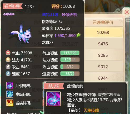 冥灵妃子:携带等级:0转80级 成长率1.275 初始HP120 初始MP144 初始SP72 定位为敏血召唤兽