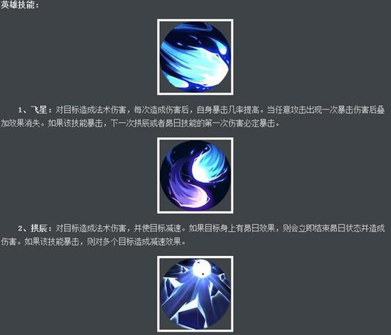 英雄特点:飞星->拱辰->昴日,按顺序施放方可最大化技能效果,暴击不断。