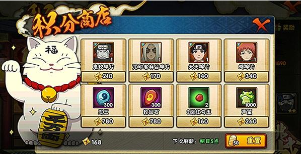 积分赛:每天可打六场,比赛结束会奖励铜币和积分。积分可在积分商店换取忍者碎片,以及忍玉、声望等各种提升战力的道具。每天的六场都建议打完,无论输赢都是会奖励金币的。而积分兑换建议集中一个忍者进行兑换,这样相对来说性价比会高一些。若已有该忍者,可根据自身来兑换其他东西。