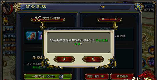 毋庸置疑,商会跑环这个周任务的环数非常多,但是个人建议大家不要嫌麻烦,这毕是我们获取大量银子的好地方。更重要的是,这里的任务基本都是自动寻路,还算是比较方便的。大家没事的时候可以顺手点击几次,大量的银子就到手,何乐而不为呢?倘若不想花钱,只要我们每天上线挂机跑二、三十环,还是可以很轻松地完成一周的200个跑环任务的。