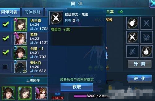 1、点开伙伴系统,选择一个伙伴点开所缺符文的空缺,再点一下所缺符文的获取。