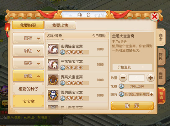 拥有房屋的玩家,在商会界面中购买宝宝窝,使用后庭院中即会出现一只可爱的萌宠。不同的房屋可以饲养的萌宠数量上限不同: