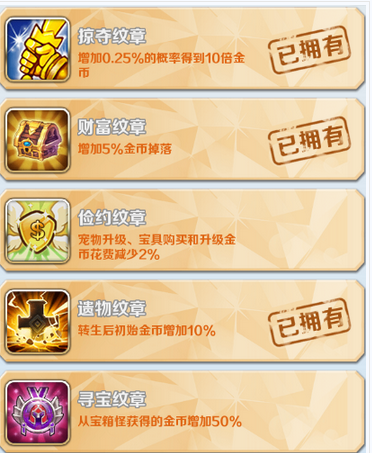财富纹章(增加金币掉落百分比,快速获取金币升级宝物冲关)