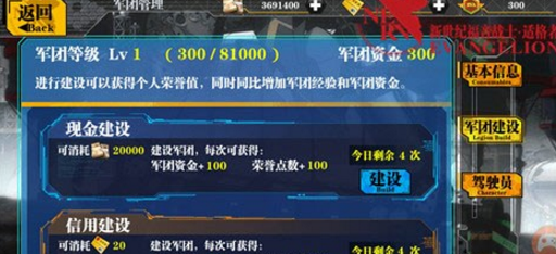 军团成员可以通过军团建设获得个人荣誉值,同时同比增加军团经验和军团资金,有现金建设和信用建设两种方法,每天有五次建设的机会哦。当军团筹集一定的军团资金时和达到相应的等级时即可解锁军团管理人员,让你的军团更加强大起来吧。