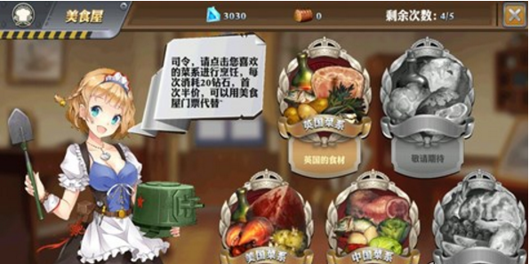 1.美食屋内司令可以消耗20钻石(每日初次烹饪半价)或美食屋门票(完成日常10次远征任务后获得)请维克斯大姐姐做一份美味的料理。