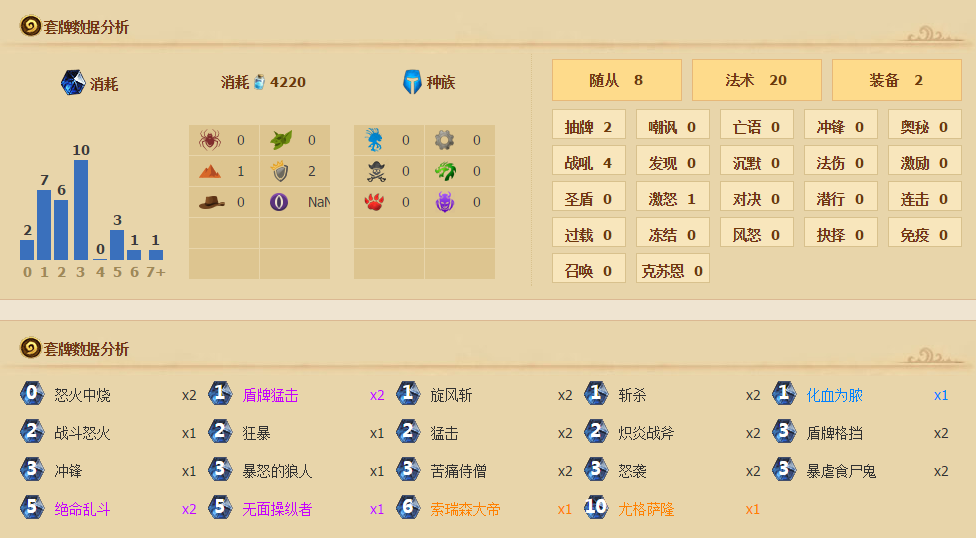 小编以前玩狼人战的时候,带上了2张狼人和冲锋,还有末日和328等等,不过新版本328标准模式带不了。总觉得这卡组前期很难苟得住,所以有时候看环境会带上433海盗和吵吵。这个根据具体情况而论、总得来说,斩杀是突破天际了,只是很难苟得住和排序的问题,然后瓦娘多带法术的原因,也有配合傻龙的意思。