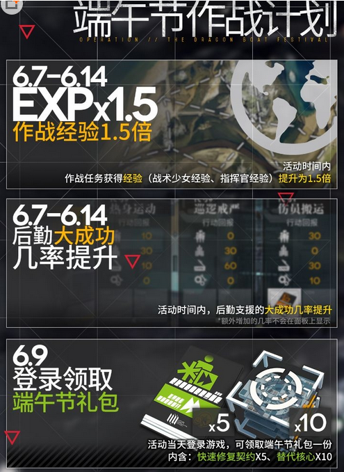 少女前线端午活动大全,端午节到底有什么活动,为迎接端午节那天的到来,少女前线到底会有什么精彩的活动,为了迎接即将到来的端午节,《少女前线》将开启“端午节作战计划”!少女前线准备了丰厚的大礼来回馈各位玩家哦~多倍作战经验、端午节礼包,西西带各位先一睹为快吧。