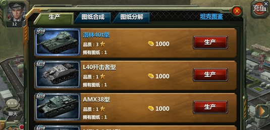 玩家可以在生产车间中花费金币生产对应设计图的坦克。