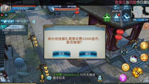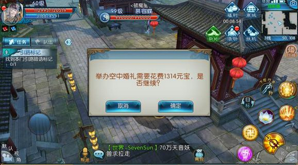 第四:当你以上条件都有后,就可以去月老那里结婚了。婚礼是有空中婚礼和普通婚礼(婚礼模式应该有几种的)的~空中婚礼需要花费1314元宝的。(暖心只想说,好贵!)传统婚礼则只需要52000金币(不愿意花钱的可以选择。)结婚战斗力有提升。