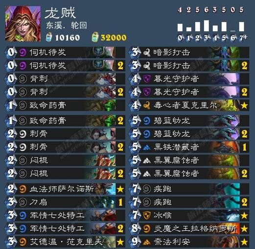 龙贼靠的是喝龙牧一样的思路:场面。双疾跑、蓝龙、刀扇、血法、毒心者都能给你充分的手牌。而伺机待发、闷棍、背刺、军七、腐蚀者则能给你带来节奏。面对铺场职业,黑铁、冰喉、血法刀扇能挽救局势。