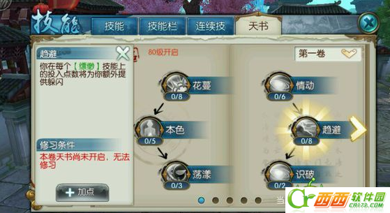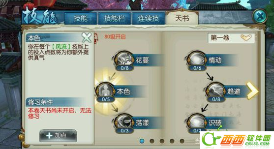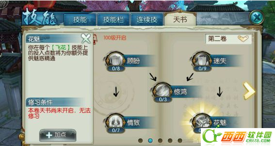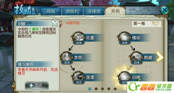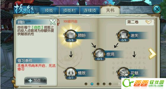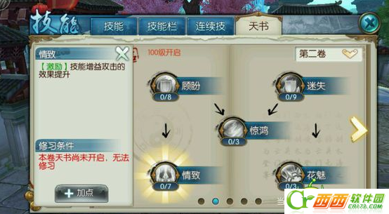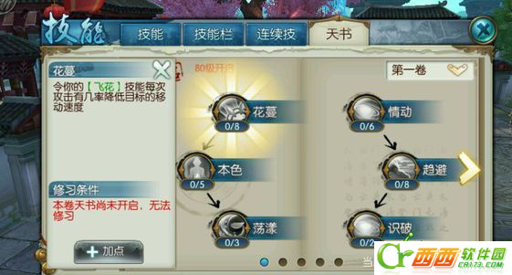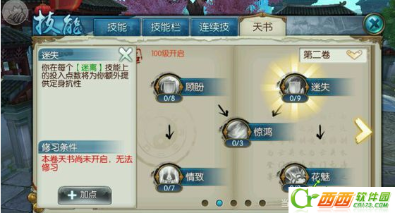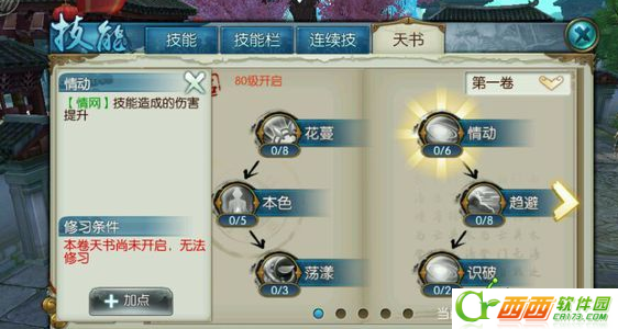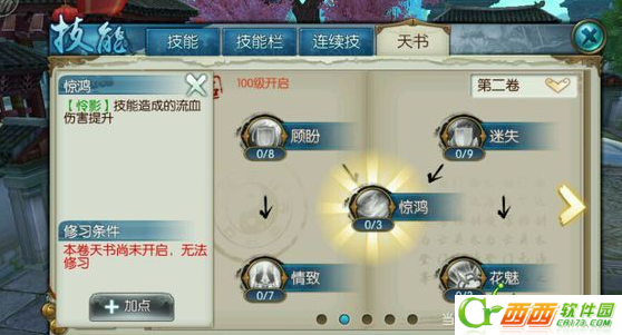 控制流路线:情驰第一卷、情驰第二卷、情驰第三卷、情驰第四卷、情驰第五卷、离恨第一卷。这个加点主要是为了打出足够的控制连招,以秋波、怜影为核心技能,控制的同时堆叠减速技能和流血效果,伤害越打越高!