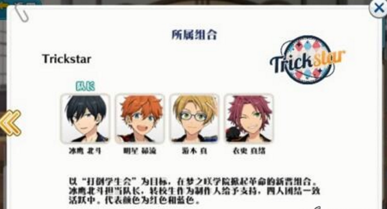 下面,再给各位转校生简单介绍一下冰鹰北斗的组合吧。冰鹰北斗所属的组合是「Trickstar」。