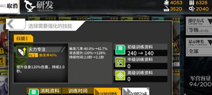 在训练枪娘技能时,需消耗特殊材料“训练资料”,训练时需一定时间等待训练结束,也可使用道具立即完成。