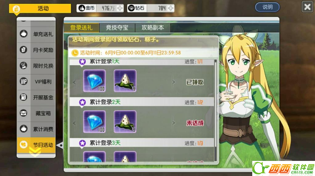 1、通过每天登陆,即有钻石奖励又有粽子可收集;分3天登陆,一天5个合计15个粽子。