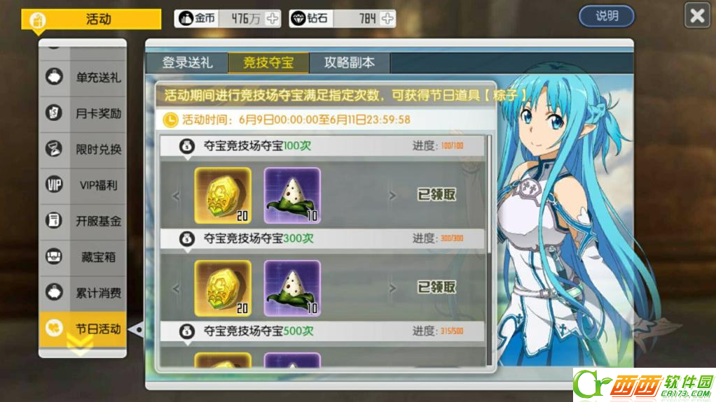 而有一些钻石的玩家或小氪玩家,可以通过购买VIP福利的300钻石的礼包(10瓶体力、10瓶耐力),然后每天商店购买10瓶体力330钻石;合计话费1290钻石可完成主线副本胜利200次(精彩活动里有个单冲50元获取5瓶体力和耐力的充值活动),领取32粽子。