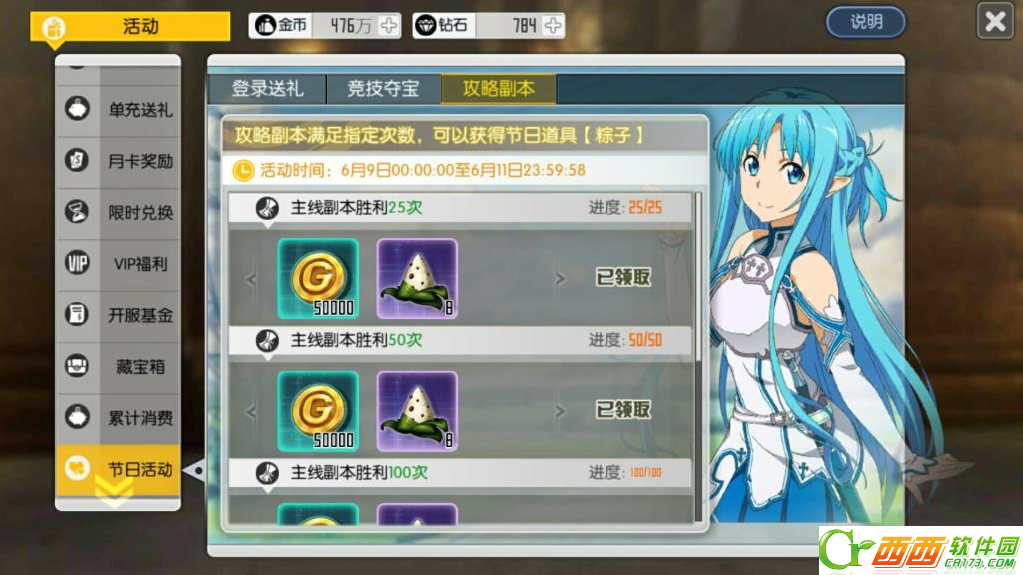 3、攻略副本,攻略副本满足制定次数,即主线副本胜利25次可获得8粽子外加金币,胜利50次8粽子,胜利100次8粽子,胜利200次8粽子,胜利350次8粽子,合计40粽子,30万金币。