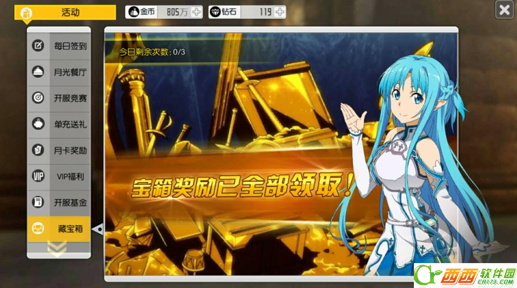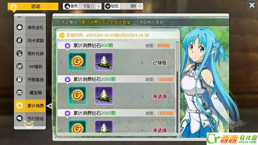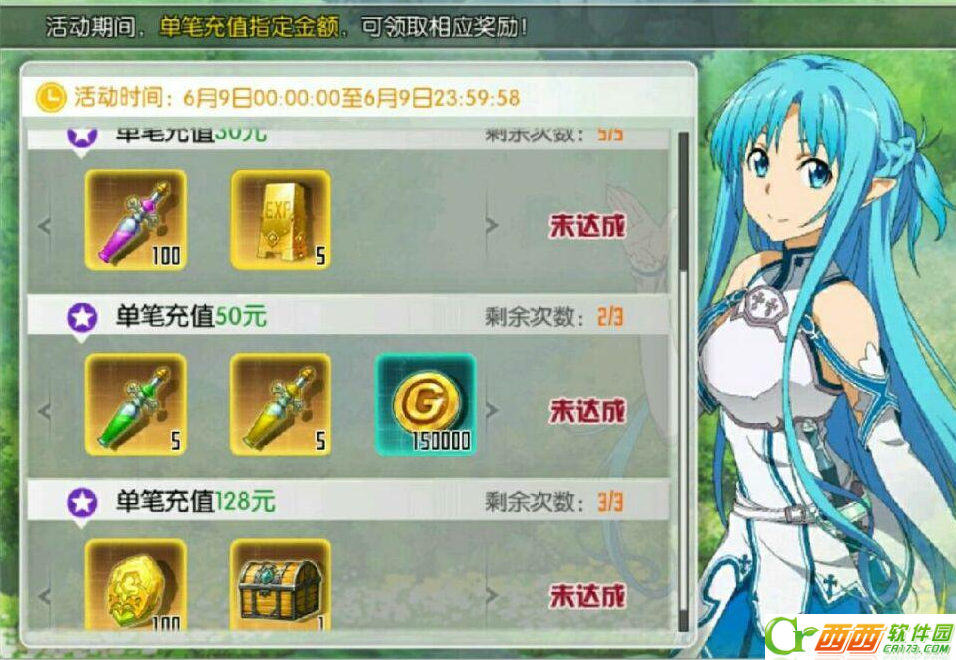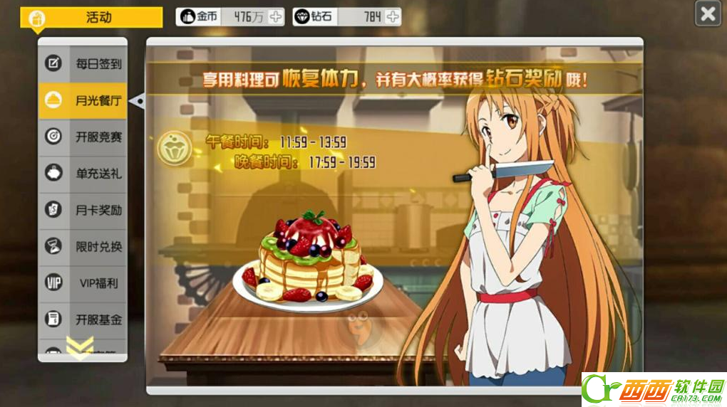 2、可在12点到2点以及6点到8点去亚丝娜界面领取50体力,合计100。