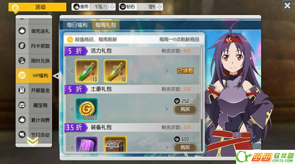 6、精彩活动中VIP福利每周礼包的活力礼包300钻石10瓶体力药水和10瓶耐力药水,比较便宜划算。