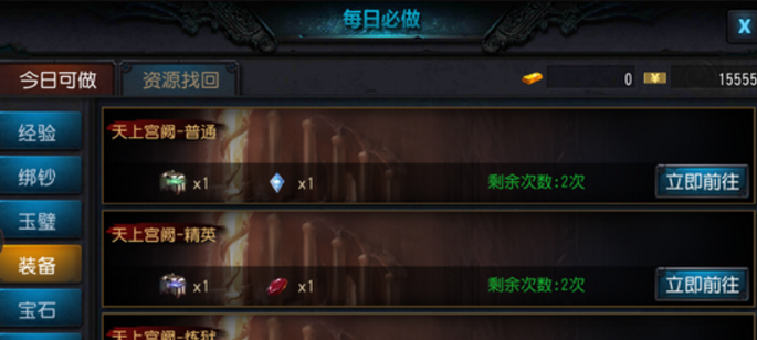 天上宫厥副本一共分为三种模式,分别为普通、精英和炼狱,每天可以各完成2次,每种模式所获取到的装备品质也不一样,而普通模式可以获取到三阶装备。