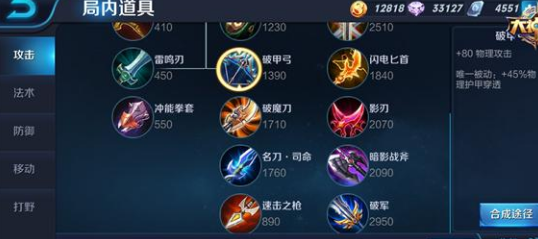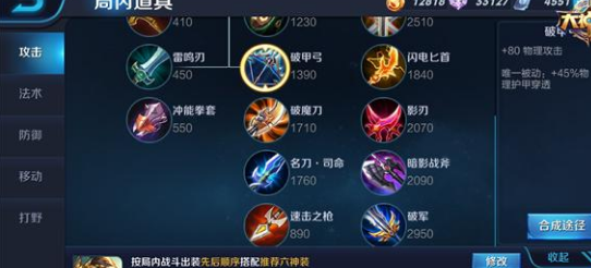 中期装备的选择对后期的战局发展较为重要,虞姬的中期出装主要以纯攻击出装和半攻击半防御出装为主。纯攻击出装先出闪电匕首,可以增加虞姬攻速、暴击率和移速,被动效果可以产生电弧对敌方造成额外伤害;选择破甲弓可以增加虞姬的攻击力,同时让其拥有高达45%的物理穿透能力,对敌输出能力更明显;鞋子选择急速战靴,额外增加攻击速度的能力让虞姬的普攻速度更快。
