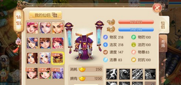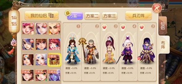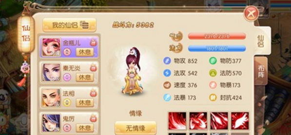 玩家再选定好出场战斗的仙侣人物后,可以通过点击布阵里面的仙侣人物来调整人物的位置。头上带有心型的图标则说明当前的仙侣有情缘触发,在战斗中会有额外的加成。