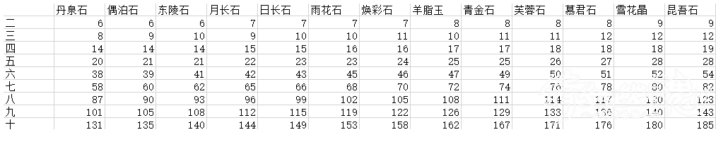 丹泉石、偶泊石、东陵石、月长石、日长石、雨花石、焕彩石、羊脂玉、青金石、芙蓉石、慕君石、雪花晶、昆吾石各高级宝石升级所需数量,如上图所示。