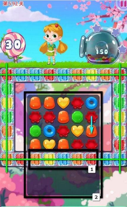 3、随着破冰的不断深入,就要开始主攻泡泡糖了,否则到最后会因为界面中的泡泡不够多而过不了关。在绿色直线处多做直线特效可以最大限度地炸开泡泡糖(当传送带转到底部时,尽量在1区的最左边生成特效,这样传送带转动3个单元格时特效依然在操作区中)。