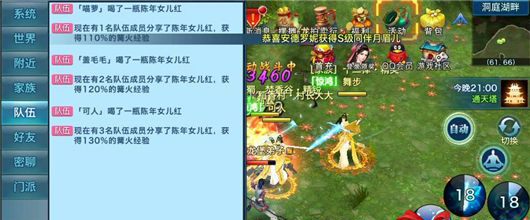 队伍中喝酒的成员越多,可享受的加成越高,也就是说当队伍中的四位成员都饮酒时,全部队员最高可享受140%的篝火经验。当开启10倍修炼时间时,喝酒则会变得相当划算,你会看到大量的经验不断腾起。