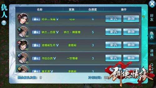 在社交系统中有一个选项卡叫仇人,只要是那个人曾经杀死过你,不管是普通地图还是pk地图,即使是在武林盟主等活动中都会成为你的仇人。在仇人系统里,我们可以对自己的仇人复仇,每个仇人都有仇恨度,一旦复仇成功我们就可以从仇人身上摸些银两进口袋,同时他的仇恨度也会下降,当他的仇恨度降到0时,他就不再是我们的仇人了,当然,复仇失败的话是什么都不会变的。每天可以复仇10次,每次复仇都会有冷却时间。