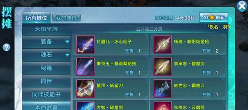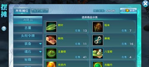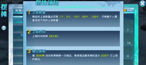 3、摊位刷新:每30分钟自动免费刷新一次商品,每类商品最多随机显示200个已上架的商品。