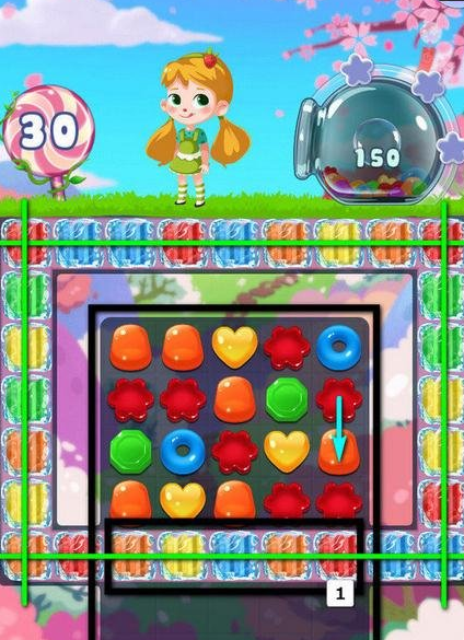 3、随着破冰的不断深入,就要开始主攻泡泡糖了,否则到最后会因为界面中的泡泡不够多而过不了关。在绿色直线处多做直线特效可以最大限度地炸开泡泡糖(当传送带转到底部时,尽量在1区的最左边生成特效,这样传送带转动3个单元格时特效依然在操作区中)。