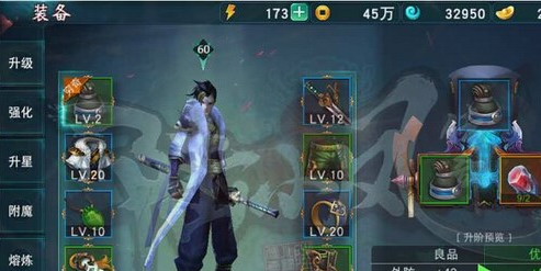 装备养成系统,系统里提供了七种装备养成玩法,包括:升级、升阶、强化、升星、附魔、熔炼、传承