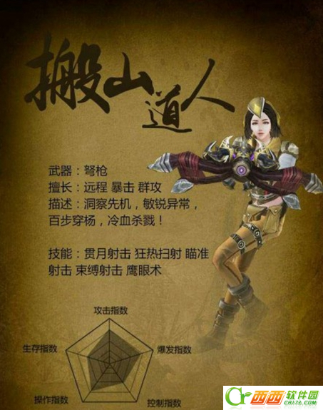 职业介绍:洞察先机,敏锐异常,百步穿杨,冷血杀戮!拥有女性所特有的强大的直觉,能够准确发现目标,所谓搬山有术,能够准确的找到敌人的弱点。