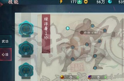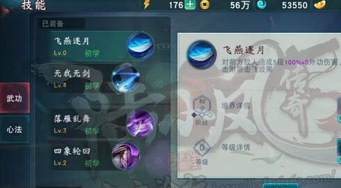 (1)武功界面可以对已有的武功技能进行配置,技能突破将提升武功的境界,而修炼将提升武功的等级;