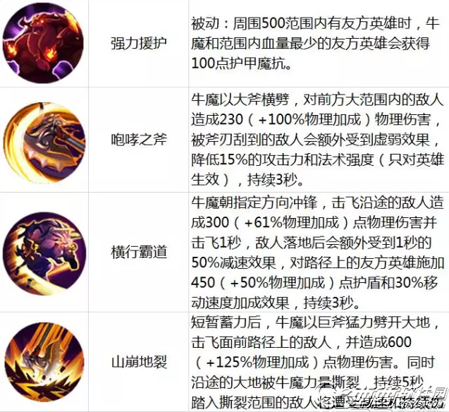 控制型的辅助,本身血厚防高,被动可以为队友加防,还有减攻击和二段的击飞,让牛魔在团战当中可以很好地保护我方核心英雄。