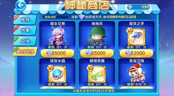参与宝藏争夺赛,获取水晶,到神秘商店的限时兑换奖励栏中,使用水晶兑换!