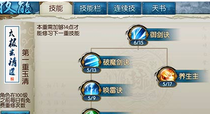 第一重御剑诀、破魔剑、唤雷决点满,五气朝元满因为没魔很尴尬,养生适当。