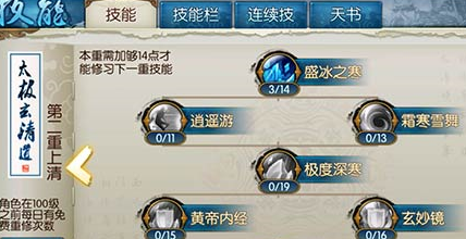 第二重逍遥游1点、盛冰之寒1点、霜寒雪舞满前期AOE都靠他、真元华闪,其他适当。