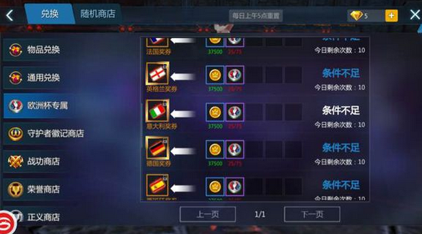 国家奖券一共有五种,分别是德国,法国,西班牙,意大利和英格兰,冒险者可以选择任意国家的奖券,兑换任意数量,比例为75代币=1国家奖券。