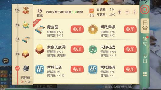 每天的12点半至1点的人参果活动是帮派活动,只要呆着人参果旁边,也能得到经验。人参果是单人任务,合作照顾人参果树,施肥浇水除虫各10次就可以摇落人参果,点击人参果就可以得到几个二级药。每人最多可以照顾20次人参果树。