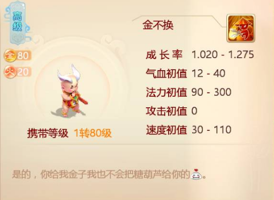 通过计算我们得出,全敏金不换的速度已经被主流敏宠远远甩在身后,而其他属性还都说得过去。金不换的血法加点也能达到十万血和十三万的法。但是如果单纯的拿来做血宠力宠,和其他召唤兽比也没有任何亮点,所以在这里要给大家推荐一种另类的金不换。