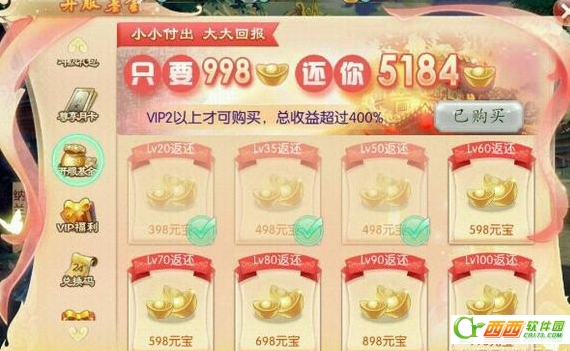 这个时候,你的手上已经有足够的元宝。虽然暂时不能十连抽,但是,请不要犹豫,先用已经入手的元宝购买开服基金,998元宝换5184元宝,升到50级就已经回本了,小投资大回报。