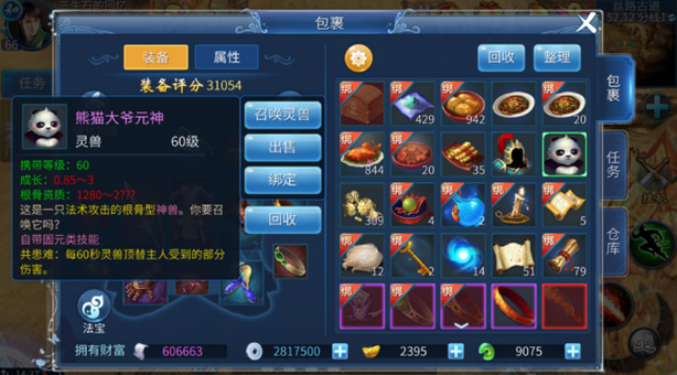 二,熊猫大爷。法术根骨类型,自带共患难固原技能,和肥猪一样是个彻头彻尾的肉盾定位。也是目前最好的肉宝宝。
