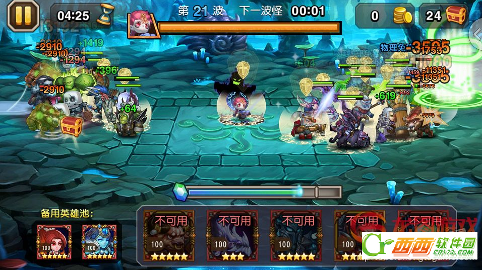 后面的只要注意一点两边的平衡性,基本上可以慢慢打了,尸王到了21关开始,牛头人上场,牛头人有个群攻晕眩的小技能,基本伤害不大。