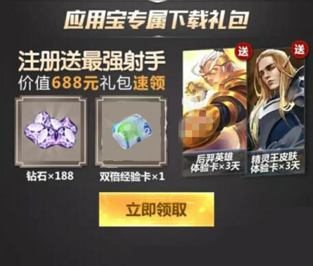 除了抽奖礼包外,还有应用宝专属礼包,注册就送最强射手,价值688元的大礼包哦!你还在等什么!新手玩家们赶紧来领取,错过了等一年!礼包中内有188钻石!!