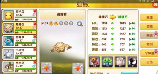 积累够了玩偶就可以点击突破精灵,突破成功,精灵的个体值就会发生变化。特训也是相应的方法,收集足够的沙袋就可以完成特训,同样可以提高宠物的战斗力。