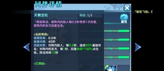 天舞宝轮:对阵内敌人,每0.5秒,造成50%基础攻击;对阵内的友方,每1秒,回复体质*100%点生命。阵法持续10秒。