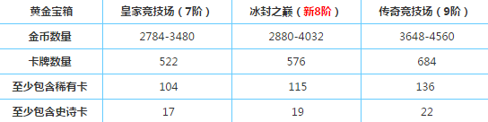 这次的变动对原来的皇家竞技场以及传奇竞技场并没有太大的影响,包括他们的宝箱所含卡牌数量都是保持不变的。