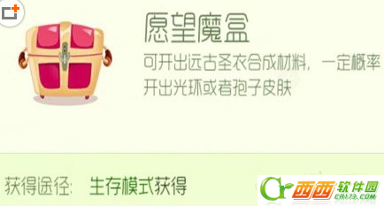 最新的三种魔盒分别都是通过生存模式才能获得,之前说过至尊魔盒开出的奖励可开出大量远古圣衣合成材料,较高概率开出光环或者孢子皮肤,而愿望魔盒开出的奖励呢就是可开出远古圣衣合成材料,一定概率开出光环或者孢子皮肤。